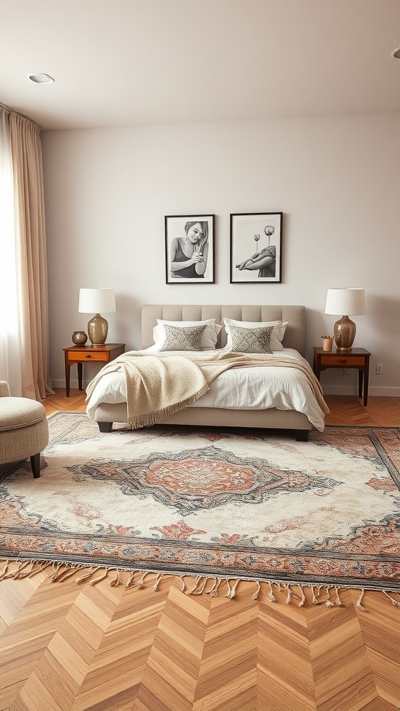 Layering rugs can add a unique touch to your living space. In the image, we see a beautifully styled room featuring a large, ornate rug beneath a cozy bed. The intricate patterns and warm colors of the rug create a welcoming atmosphere.
