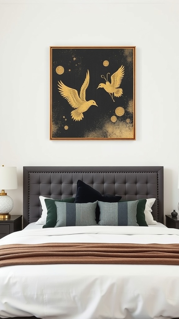 The artwork features elegant birds in flight, adding a sense of movement and grace to the room. This kind of piece not only draws the eye but also sparks conversation. It’s perfect for those who want their bedroom to feel unique and stylish.