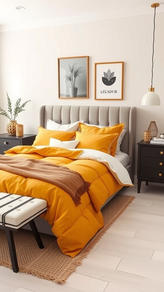 The mustard yellow and gray color scheme creates a warm and inviting atmosphere in a bedroom. The bright yellow bedding instantly draws attention, adding a cheerful touch to the space. This color combination is perfect for those who want a lively yet sophisticated look.